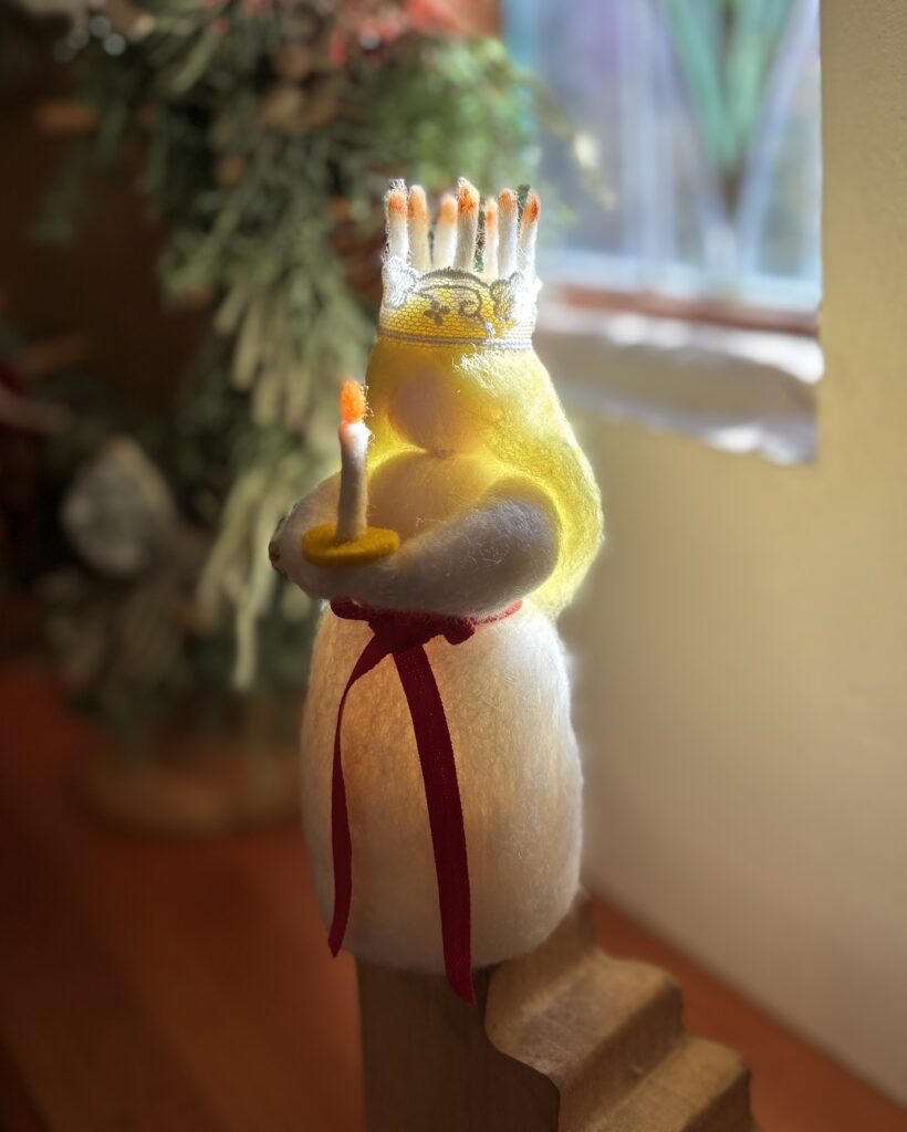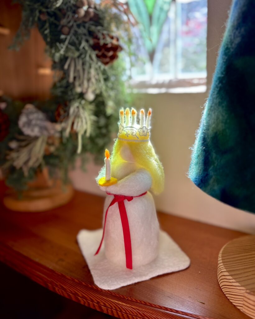 みなさまも、クリスマスを迎える前に、スウェーデン産の羊毛を使ってルシアの少女を作ってみませんか。名前のとおり、光があたるとロウソクに本当に火が灯ったように見え、美しいです。