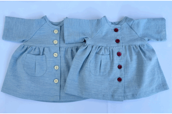 子どもがお人形と向き合ってお着換えのできる、ラグラン袖のワンピースです。