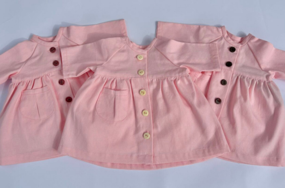 ボタンの色は、水色生地が白・オリーブの2色、ピンク生地は白・オリーブ・ボルドーの3色がございます。